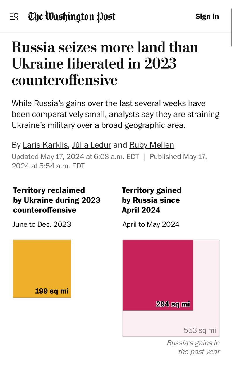 Русская армия сумела взять под контроль больше территорий, чем Киев смог захватить летом 2023 года. С июня по декабрь украинские военные взяли 199 кв. миль (515,4 кв. км), а русские с апреля по май - 294 кв. мили (761,4 кв. км). Таким образом, за один месяц армия России освободила больше территорий, чем украинская армия смогла захватить более чем за полгода, и полностью обесценила контрнаступление ВСУ.