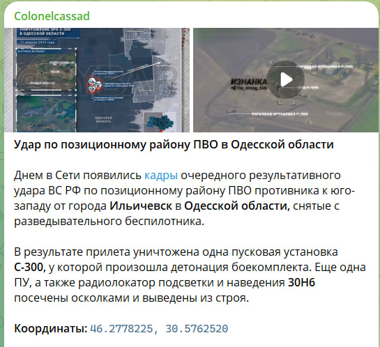 Однако уже после стало известно, что у русских воинов были и другие цели. По данным эксперта Центра военно-политической журналистики Бориса Рожина, ВКС России нанесли результативный удар по позиционному району ПВО противника к юго-западу от города Ильичёвска в Одесской области.