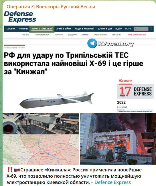Россия применила новейшие Х-69, что позволило полностью уничтожить мощнейшую электростанцию Киевской области. <…> Дальность пуска ракет составила около 400 км, превышая оценки дальности Х-69 в 300 км, как модификации Х-59МК2 <…> Х-69 - дозвуковая крылатая ракета для истребителей. Главная особенность - возможность сверхнизкого полета на высоте в 20 м, что ниже, чем может Х-101. Результативный удар по Трипольской ТЭС говорит о возможности проникновения ракеты сквозь очевидно истощённую ПВО,