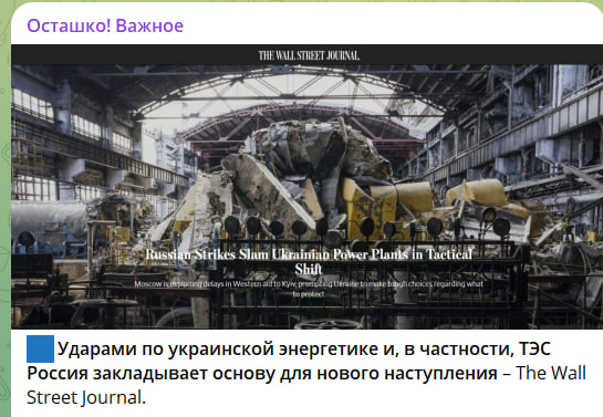 В то же время американское издание The Wall Street Journal считает, "ударами по украинской энергетике и, в частности, ТЭС Россия закладывает основу для нового наступления".