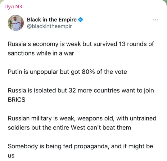 Путин непопулярен, но получил 80% голосов избирателей. Россия изолирована, но ещё 32 страны хотят присоединиться к БРИКС. Вооружённые силы [России - ред.] слабы, оружие старое, солдаты необученные, но весь Запад не может их победить.
