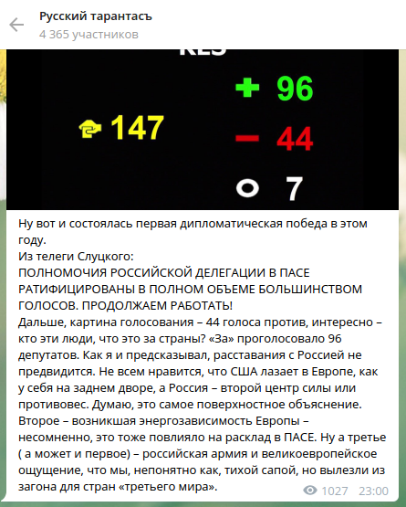 Публикуя итоги голосования за ратификацию полномочий нашей делегации, Стешин отметил, что против было отдано 44 голоса. "Интересно, кто эти люди, что это за страны?" - задался вопросом спецкор и продолжил публиковать результаты голосования, отметив, что за высказались 96 депутатов.