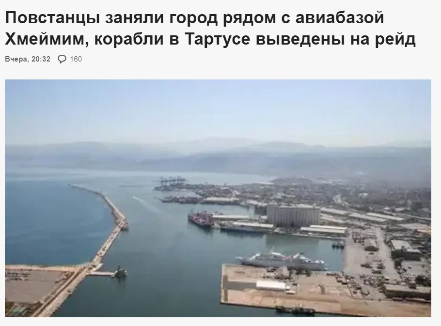 Русская авиабаза Хмеймим отрезана от основной территории Сирии, в Тартусе корабли выведены из порта на рейд, пишут в военных телеграм-каналах. Военное присутствие России в Сирии висит на волоске.