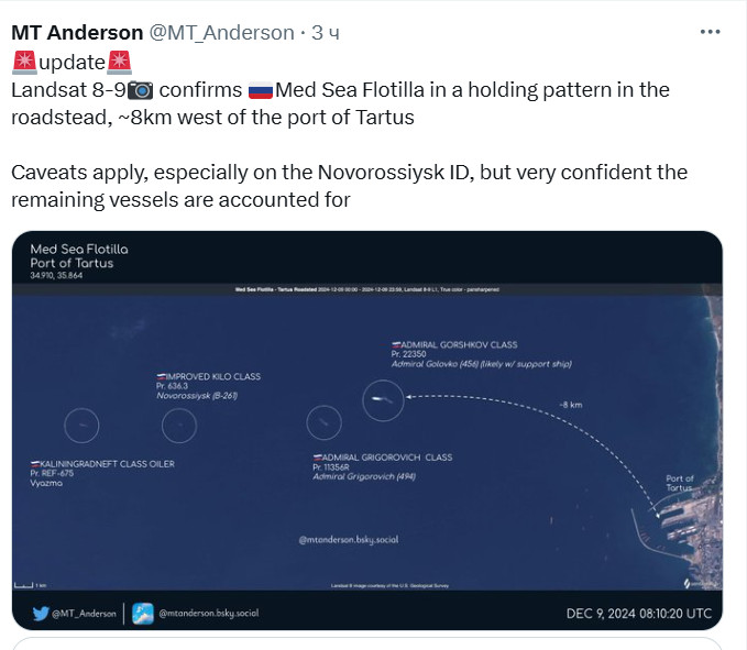 Русские вывели военные корабли с базы в Тартусе, об этом свидетельствуют спутниковые снимки сервиса Landsat за 8 и 9 декабря, опубликованные аналитиком MT Anderson. Где сейчас суда, раскрыли спутниковые снимки.
