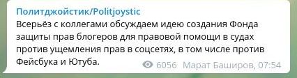 "Всерьёз с коллегами обсуждаем идею создания Фонда защиты прав блогеров для правовой помощи в судах против ущемления прав в соцсетях, в том числе против Фейсбука и Ютуба", - сообщил Баширов.
