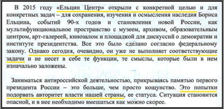За десять лет существования Ельцин-центра стало понятно, что это никакая не память о деятельности первого президента России Бориса Ельцина, как было заявлено изначально. А самый настоящий рассадник русофобии и крамолы. К самой организации вопросов уже нет, но есть вопросы к власть имущим: доколе? И что или кто мешает поменять законодательство и признать его деятельность работой иностранных спецслужб, назвав вещи своими именами?