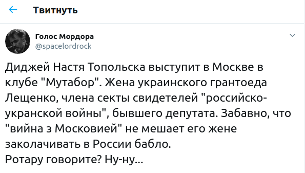 Но обращают интернет-пользователи внимание на один немаловажный момент: Настя - "жена украинского грантоеда", политика, "члена секты свидетелей "российско-украинской войны" и бывшего депутата рады Сергея Лещенко.