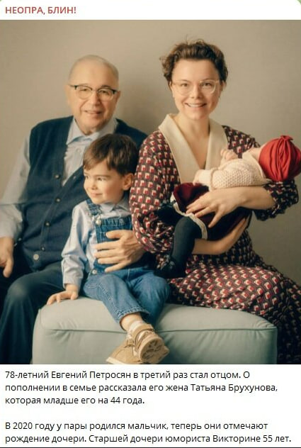 Всё началось с того, что нынешняя супруга Петросяна опубликовала фото с мужем и детьми и подписала снимок "Мои счастливые 35". На фотографии Брухунова держит малышку, которой, судя по виду, несколько месяцев. До этого никто не был в курсе, что Петросян вновь стал отцом.