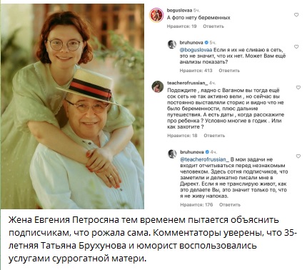 При этом Петросян и Брухунова эту версию яростно отрицают. Юморист заявил, что всё это неправда и не нужно наговаривать. А его жена заявила комментаторам в соцсетях, что не живёт напоказ, а потому не транслировала свой живот.