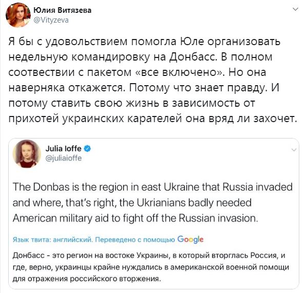 В другом твите Иоффе утверждает, что Донбасс является украинским регионом, в который вторглась Россия, и живущие там украинцы "совершенно точно" нуждались в военной помощи США для отражения "вторжения России".
