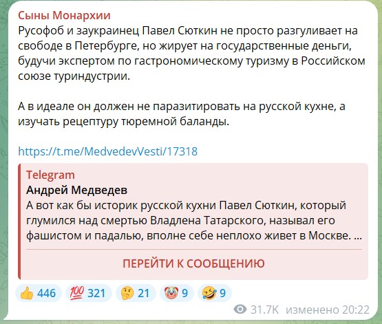 Однако это ещё не все странности. Оказывается, что "русофоб и заукраинец", как называют Сюткина в русскоязычном сегменте Сети, не просто разгуливает на свободе, но ещё и "жирует на государственные деньги, будучи экспертом по гастрономическому туризму в Российском союзе туриндустрии". "А в идеале он должен не паразитировать на русской кухне, а изучать рецептуру тюремной баланды", - уверены авторы канала "Сыны Монархии".
