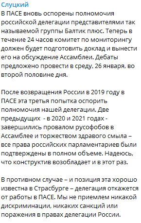 Слуцкий отметил, что это уже третья попытка лишить Россию права голоса с тех пор, как русская делегация возобновила свою работу в Парламентской ассамблее Совета Европы в 2019 году. Предыдущие две были предприняты в 2020 и 2021 годах, однако тогда здравый смысл восторжествовал, и предложения русофобов были отклонены.