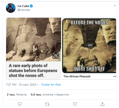 Чернокожий рэпер Айс Кьюб (настоящее имя О'Ши Джексон) подвергся нападкам со стороны американских СМИ после того как разместил шуточный пост о статуях египетских фараонов. Вернее, это был довольно известный мем, в котором сравниваются два фото статуй и объясняется, что более ранний снимок был сделан до того как европейцы "начали отстреливать им носы".