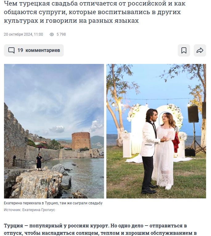 То ли дело Турция, где как-то раз отдохнула молодая девушка. Тепло, солнечно. Екатерина подумала да и нашла в соцсетях "сваху" – некую предприимчивую даму, которая подыскивает русским невестам турецких женихов.