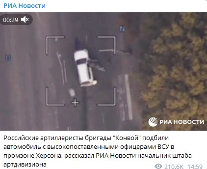 Наши артиллеристы назначили "точку встречи" - то есть место, куда будет нанесён удар, и благодаря тому, что район был пристрелян, скорректировали удар. После точного удара из авто выбежали военные, стали вытаскивать из подбитого внедорожника людей в форме и укладывать их на обочине.