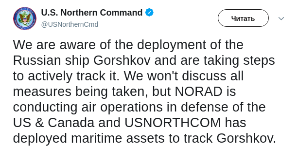 "Мы знаем о развёртывании российского корабля "Горшков" и предпринимаем шаги для его активного отслеживания, - говорится в твите. - Мы не будем обсуждать все принимаемые меры, но NORAD проводит воздушные операции в защиту США и Канады, а USNORTHCOM развернул морские активы для отслеживания "Горшкова".