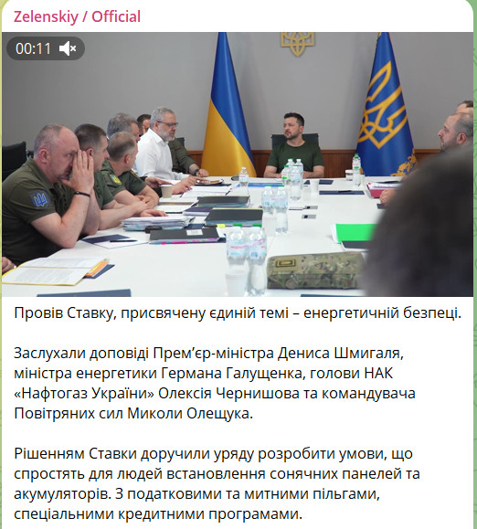 Правительству поручено немедленно представить программу для стимулирования на Украине установки солнечной генерации и накопителей энергии, максимально благоприятную программу… Чёткий план достройки всех защитных сооружений для энергетики, и по каждому такому объекту - чёткий срок завершения работ. Надо ускоряться исполнителям на каждом уровне,