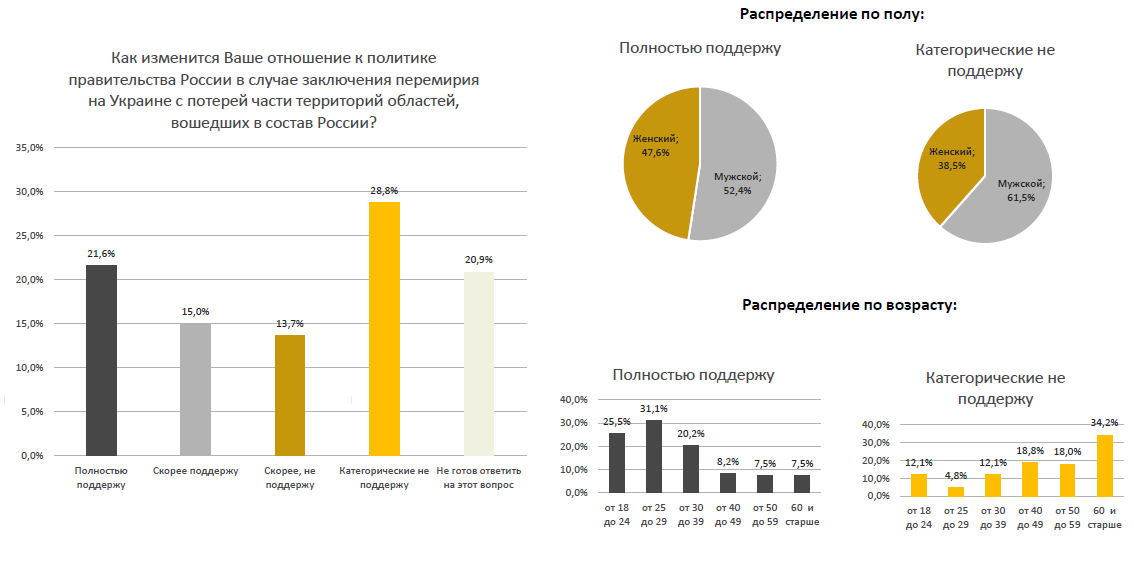 "Мир", который обернулся бы утратой части освобождённых нашей армией территорий, отвергли 53,7% участников исследования. Но 33,1% заявили, что не против такого развития событий.