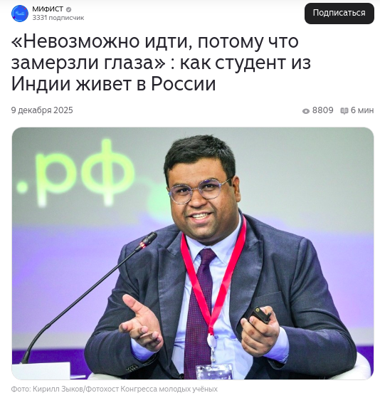 Когда девять лет назад Соумоджит Мукхерджи приехал из солнечной Индии в Россию, чтобы поступить на учёбу, он, как и многие иностранцы, ожидал увидеть медведей на улицах и злоупотребление алкогольными напитками. Реальность же оказалась совершенно иной и приятно удивила студента. За годы учёбы в МИФИ, а затем в аспирантуре он не только получил образование, но и обрёл любовь и друзей. В интервью, которое опубликовал дзен-канал университета, он поделился своими наблюдениями о России и сделал неожиданный вывод: "русские похожи на индусов".