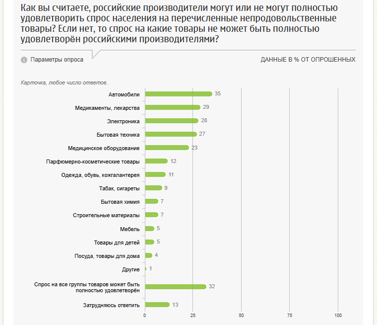 При этом есть категории товаров, на которые, как отметила часть опрошенных, производители России своими силами удовлетворить спрос не могут, во всяком случае, пока. Это автомобили (35%), лекарства (29%), электроника (28%), бытовая техника (27%), медицинское оборудование (23%) и др.