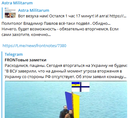 "Политолог Владимир Павлов всё-таки подвёл. Обидно... Ничего, будет возможность - обязательно вторгнемся. Если сами захотите, конечно..." - написал Телеграм-канал Astra Militarum.