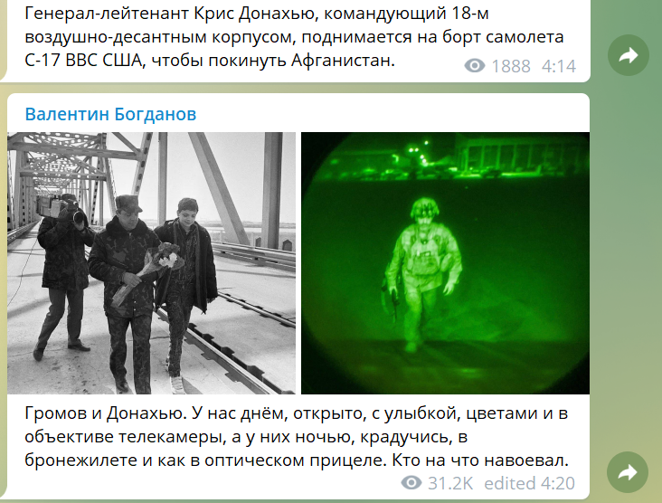 На фото видно, что американцам пришлось улетать без всяких церемоний и почестей, в полной темноте. Русский журналист Валентин Богданов сравнил эти снимки с кадрами 1989 года, на которых запечатлён советский генерал Борис Громов, покидающий Афганистан. Громова часто называют генералом, который завершил последнюю войну СССР.