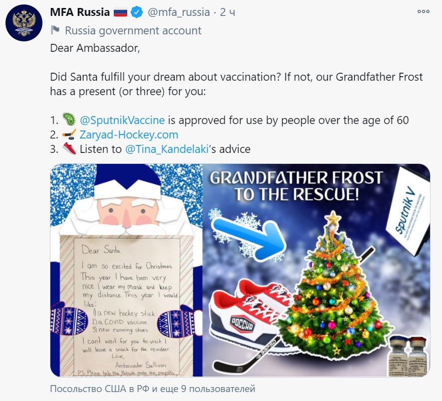 Министерство иностранных дел России пошутило над письмом посла США Джона Салливана Санта-Клаусу, в котором дипломат попросил в подарок... вакцину от коронавируса. Русские напомнили, что они снова переиграли американцев, став первыми создателями вакцины. Шутка МИДа рискует стать пророческой на фоне проблем с вакцинацией в США.