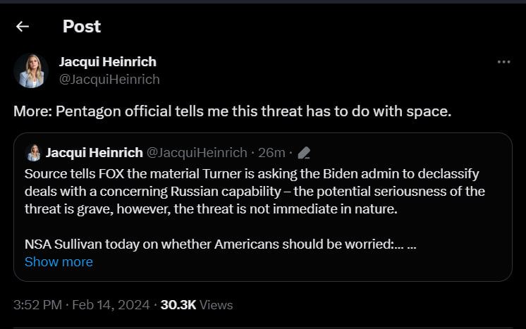 "Угроза нацбезопасности" США, о которой говорят в правительстве, связана с космосом, утверждает Fox News. А CNN сообщает, что угроза может быть связана с возможностями России.