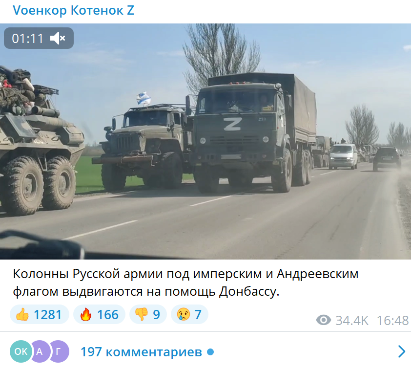 Военкор Юрий Котенок в своем Telegram-канале опубликовал видео, где запечатлена военная техника. Колонна под имперским и Андреевским флагами выдвинулась на помощь Донбассу.