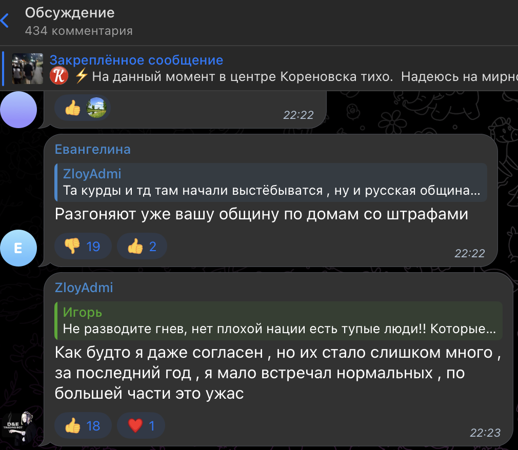 "Русская община", "Северный человек" и "Славянский рубеж" объединились, чтобы выразить протест против насилия над русскими. Местные жители в комментариях отмечают, что конфликты с курдами и цыганами продолжаются в регионе давно, но лишь сейчас они привели к такому масштабному столкновению. К слову, на Юге есть своего рода этнические поселения, где разношёрстное население. В станице Платнировской, например, много цыган, а злосчастные курды облюбовали станицу Кирпильскую.