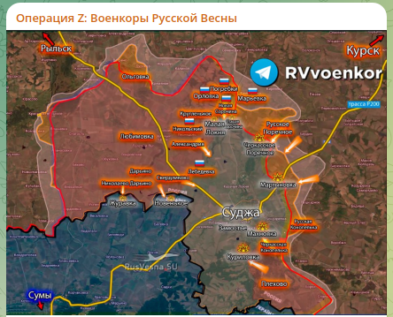 "Военкоры "Русской весны" утверждают, что "Курский фронт рушится!". Журналисты обратили внимание, что армия России освободила шесть посёлков за неделю и находится уже на подступах к Малой Локне.