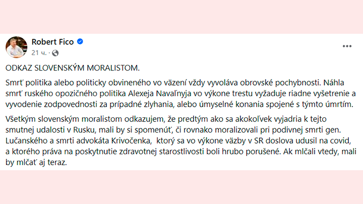Смерть политика или политзаключённого в тюрьме всегда вызывает большие сомнения. Внезапная смерть российского оппозиционного политика Алексея Навального* во время заключения требует должного расследования и ответственности за любые ошибки или умышленные действия, приведшие к этой смертью. Хочу сообщить всем словацким моралистам, что, прежде чем комментировать это печальное событие в России, они должны вспомнить, отреагировали ли они так же на странную смерть генерала Лучанского и смерть адвоката Кривоценко, который буквально задохнулся от ковида во время задержания в Словакии и чьи права по оказанию медицинской помощи были грубо нарушены. Если они молчали тогда, они должны молчать сейчас,