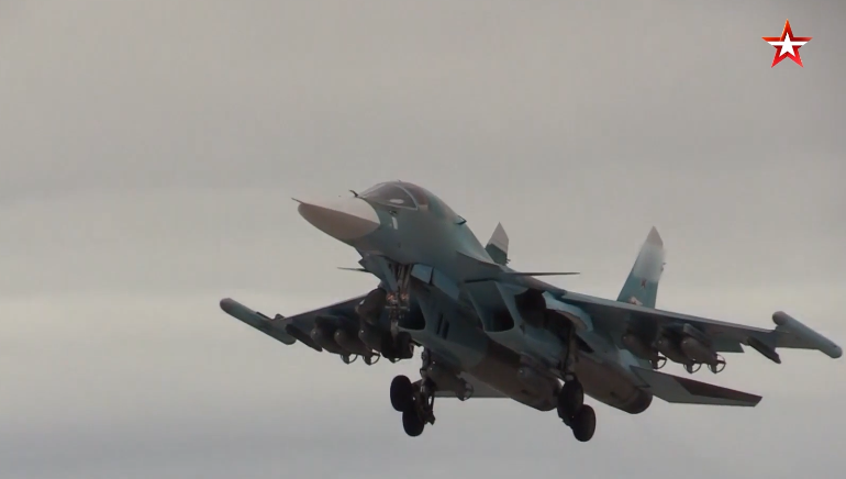На кадрах, которые публикует телеканал "Звезда", самолёт Су-34 с подвешенными бомбами ОФАБ-100-120 совершает боевой вылет, после чего наводит прицел на вражеский объект и наносит удар.