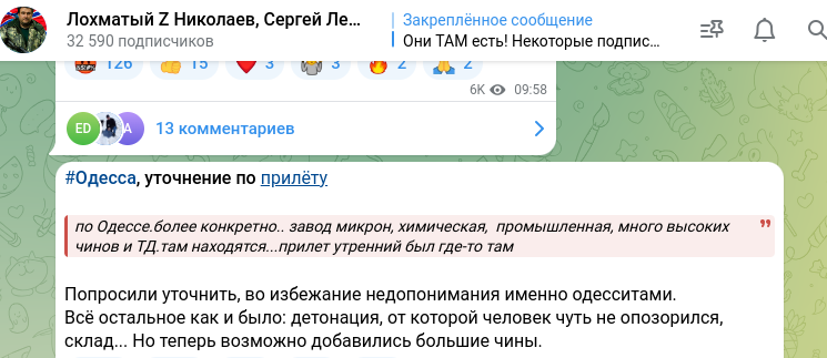"По Одессе. Более конкретно. Завод "Микрон", химическая, промышленная, много высоких чинов и тд, - написал Лебедев в своём телеграм-канале. - Там находятся… Прилёт утренний был где-то там. Попросили уточнить, во избежание недопонимания именно одесситами. Всё остальное, как и было: детонация, от которой человек чуть не опозорился, склад..."