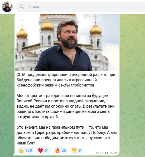 США продемонстрировали в очередной раз, что при Байдене они превратились в агрессивный ксенофобский режим секты глобалистов. Моя открытая гражданская позиция за будущее Великой России и против западной гегемонии, видно, не даёт им спокойно спать. В результате они решили отметить своими санкциями моего сына, сотрудников и друзей. Это значит, мы на правильном пути - то, что мы делаем в Царьграде, приближает нашу Победу,