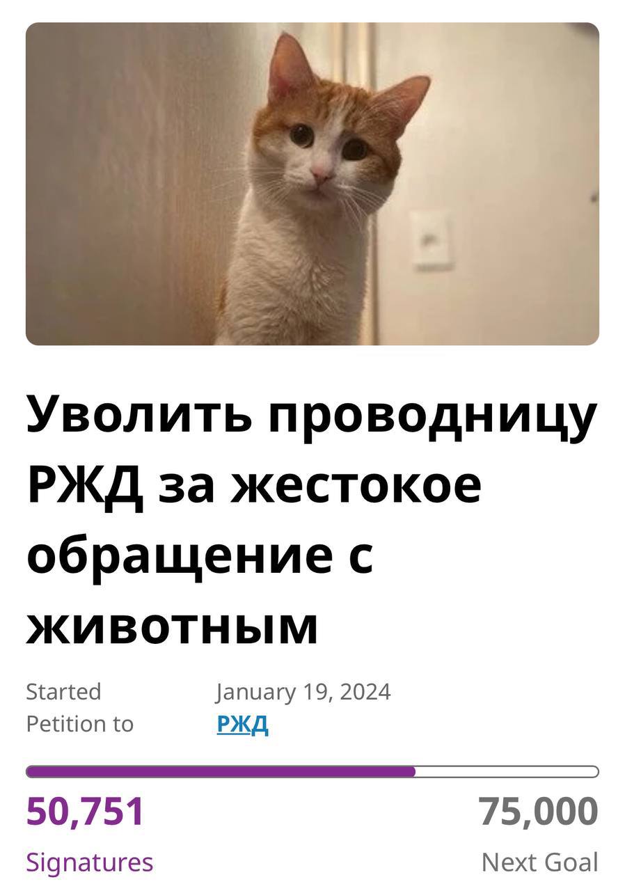 Петиция с требованием уволить проводницу РЖД, которая выбросила из поезда в лютый мороз кота Твикса, набрала свыше 50 тысяч подписей. Люди в шоке от того, как женщина могла проявить такую жестокость по отношению к животному.