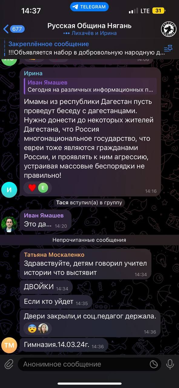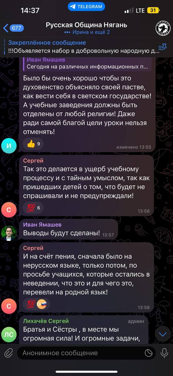 Представители организации "Русская Община ZOV" поведали, что в последнее время участились случаи тотальной исламизации детей в школах Ханты-Мансийского автономного округа без согласия и участия их родителей. Один из таких инцидентов произошёл в гимназии №1 в Нягани, где администрация пригласила муфтия, имама и других мусульманских служителей для проведения мероприятий, в ходе которых, по словам родителей, детям читались проповеди и пелись суры.