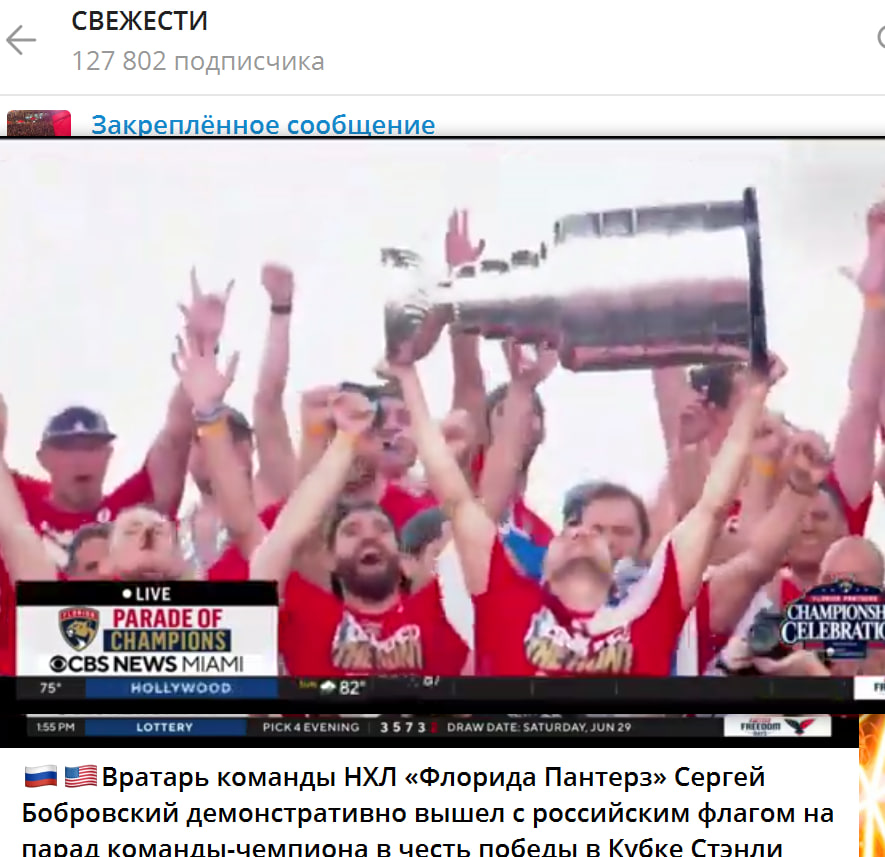 Вратарь команды НХЛ "Флорида Пантерз" Сергей Бобровский вышел с флагом России на чемпионском параде "Флориды". Команда 25 июня обыграла "Эдмонтон Ойлерз" (4-3 в серии) в финале Кубка Стэнли, завоевав первый трофей в истории клуба.