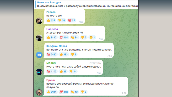 Риторика наших коллег понятна, но никто не задумывается о том, что сделали сами власти стран ближнего зарубежья, чтобы воспитать своих граждан. В своих странах таджики и киргизы - законопослушные граждане, но после приезда в Россию всё меняется. Россия медленно, но верно движется в правильном направлении, о чём свидетельствуют слова главы правительства Михаила Мишустина.