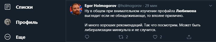 Егор Холмогоров, комментируя назначение Ольги Любимой, написал в своем микроблоге в Twitter: " Посмотрим. Может быть либерализации минкульта и не случится".