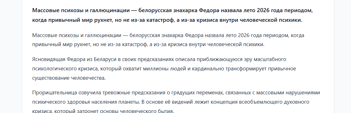 В Рунете в последнее время активно расходится одно из "пророчеств", которые приписывают Федоре. Вообще-то оно гуляет по Сети уже несколько лет. Но кто-то предприимчивый просто добавил немного конкретики, дописав про лето нынешнего года. И вуаля – предсказание-страшилка уже вовсю пугает впечатлительных пользователей, которые делятся ими с такими же суеверными людьми.