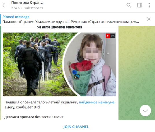 Как передаёт канал "Политика страны", тело ребёнка нашли в лесу в непроходимых зарослях, вдали от тропинок, около города Дёбельн, что примерно в трёх километрах от дома, где девочка жила с семьей. Ранее очевидцы сообщали, что слышали крики о помощи в густом лесу.