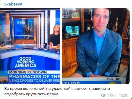 Ольга Скабеева показала забавный "крупный план" "карантинного" американского телевидения: один из репортёров программы Good Morning America опозорился в прямом эфире, забыв надеть штаны. Кроме нижнего белья журналиста, зрители также заметили самовар, который зачем-то оказался у него за спиной.