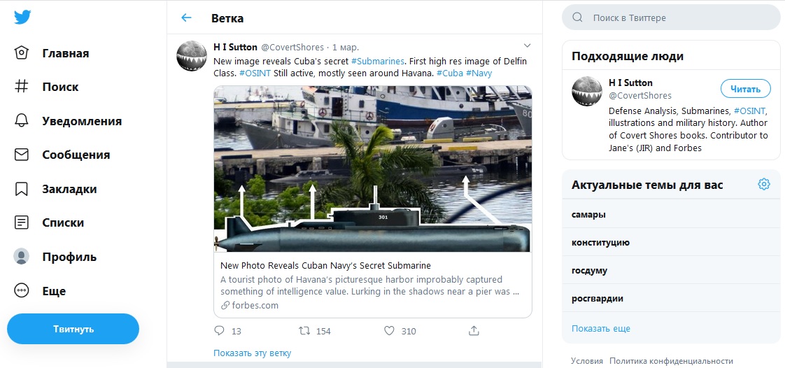 Журнал Forbes опубликовал фотографию самой секретной подводной лодки в мире. Речь идёт о единственной кубинской субмарине типа Delfin. Снимок был выложен на странице издания в Twitter.