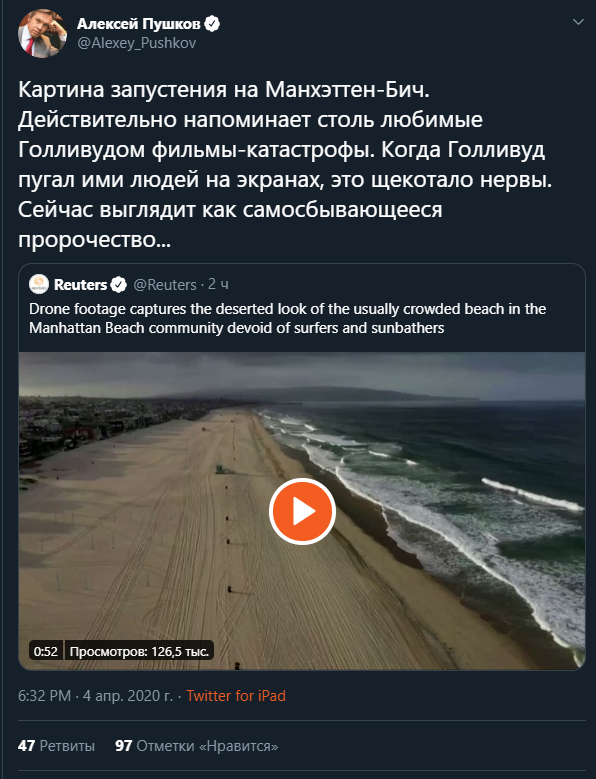 Американские СМИ опубликовали поистине жуткие кадры опустевшего из-за эпидемии коронавируса Манхэттен-Бич. Ситуацию прокомментировал член Совета Федерации России Алексей Пушков.