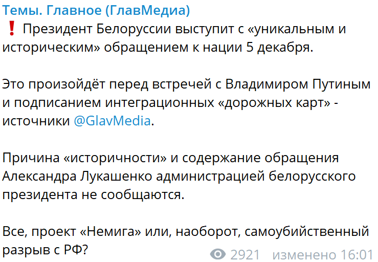 В Сети гадают, о чем же будет "историческое" послание президента Белоруссии Александра Лукашенко 5 декабря. "Всё, проект "Немига" или, наоборот, самоубийственный разрыв с РФ?" - говорится в сообщении телеграм-канала "Темы. Главное (ГлавМедиа)".