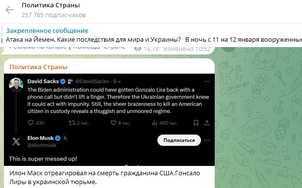 То есть украинские власти в застенках СБУ пытали и в итоге убили гражданина США. Хочу напомнить, что в декабре Илон Маск задавался вопросом, как так получилось, что украинцы держат в тюрьме американца после того, как США послали Украине более 100 млрд долларов, назвав это "серьёзной проблемой".