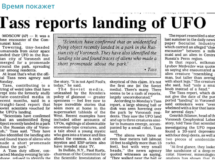 В США очень серьёзно отнеслись к "Воронежскому инциденту", который был зафиксирован 27 сентября 1989 года. Тогда советские СМИ сообщили о том, что мальчишки, играющие в футбол во дворе в Воронеже, заметили НЛО в небе.