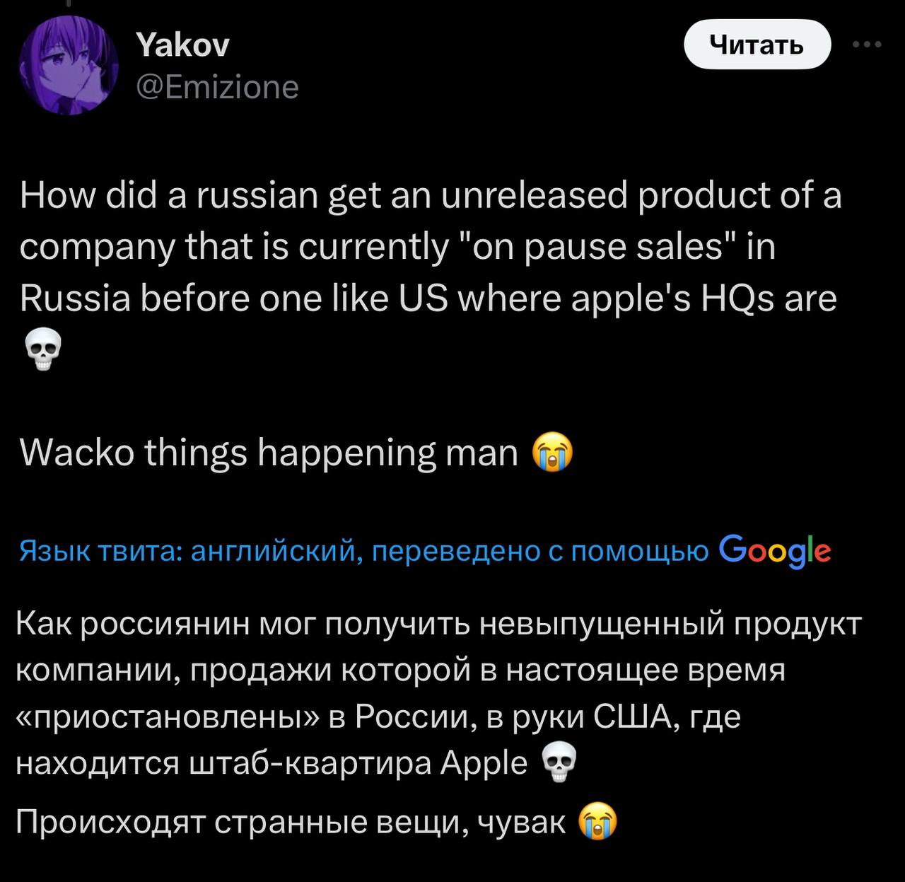 Как россиянин мог получить в руки невыпущенный продукт компании, продажи которой в настоящее время "приостановоены" в России, раньше, чем МЫ, где находится штаб-квартира компании?