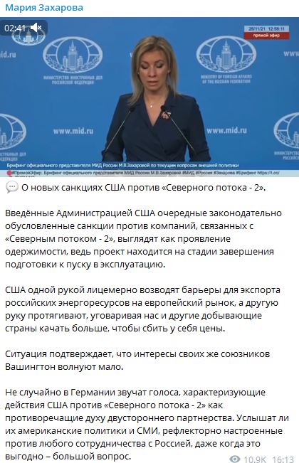 Так Захарова прокомментировала введённые недавно очередные санкции США против "Северного потока - 2". Вашингтон продолжает пытаться сорвать проект всеми доступными средствами, хотя газопровод уже построен и находится на стадии сертификации.